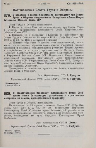 Постановление Совета Труда и Обороны. О введении в состав Комитета по скотоводству при Совете Труда и Обороны представителя Центрального Союза Потребительских Обществ Союза ССР. 6 ноября 1929 г.