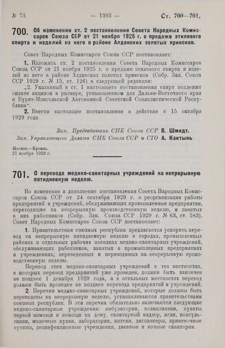 Постановление Совета Народных Комиссаров. Об изменении ст. 2 постановления Совета Народных Комиссаров Союза ССР от 21 ноября 1925 г. о продаже этилового спирта и изделий из него в районе Алданских золотых приисков. 21 ноября 1929 г.