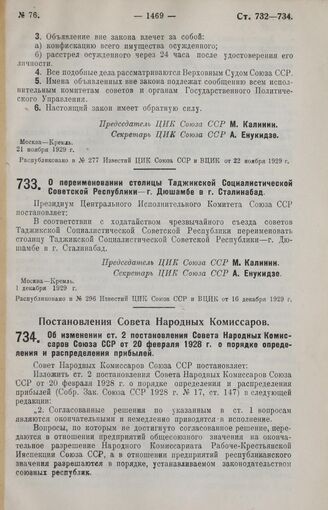 Постановление Совета Народных Комиссаров. Об изменении ст. 2 постановления Совета Народных Комиссаров Союза ССР от 20 февраля 1928 г. о порядке определения и распределения прибылей. 30 ноября 1929 г.