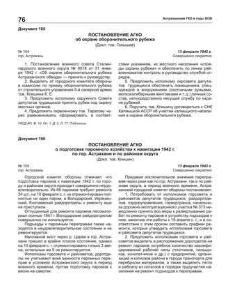 Постановление АГКО № 105 о подготовке паромного хозяйства к навигации 1942 года по гор. Астрахани и по районам округа. 13 февраля 1942 г.