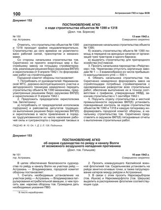 Постановление АГКО № 151 об охране судоходства по рейду и каналу Волги от возможного воздушного нападения противника. 16 мая 1942 г. // ГАСД АО. Ф. 10. Оп. 1. Д. 2. Л. 129-129 об. Подлинник.