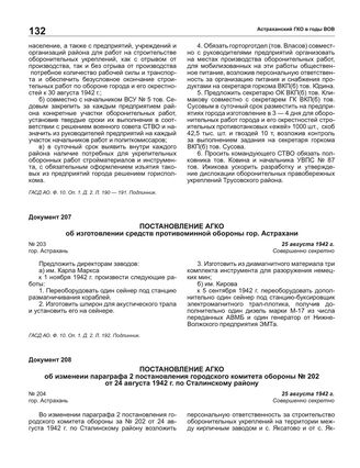 Постановление АГКО № 204 об изменении параграфа 2 постановления городского комитета обороны № 202 от 24.08.1942 г. по Сталинскому району. 25 августа 1942 г. // ГАСД АО. Ф. 10. Оп. 1. Д. 2. Л. 193. Подлинник.