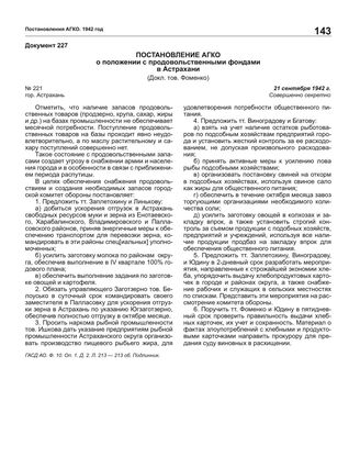 Постановление АГКО № 221 о положении с продовольственными фондами в Астрахани. 21 сентября 1942 г.