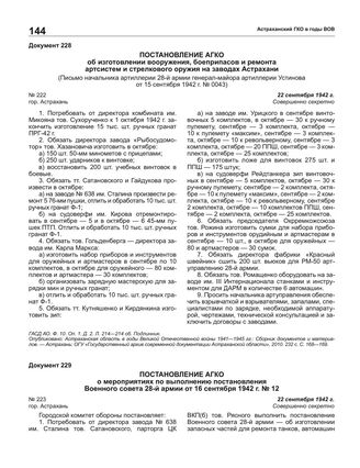 Постановление АГКО № 223 о мероприятиях по выполнению постановления Военного совета 28-й армии от 16.09.1042 г. № 12. 22 сентября 1942 г.