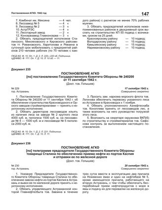 Постановление АГКО № 230 по телеграмме председателя ГКО товарища Сталина по обеспечению приема нефти из портов Каспия и отправки ее по железной дороге. 20 октября 1942 г. // ГАСД АО. Ф. 10. Оп. 1. Д. 2. Л. 222-222 об. Подлинник. ЦДНИВО. Ф. 171. Оп. 1. Д. 10. Л. 11-11 об.