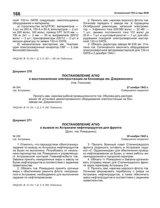 Постановление АГКО № 265 о вывозе из Астрахани нефтепродуктов для фронта. 30 ноября 1942 г.