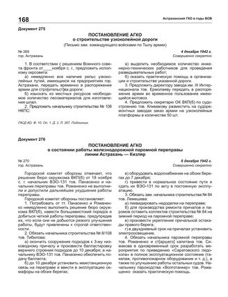Постановление АГКО № 270 о состоянии работы железнодорожной паромной переправы линии Астрахань — Кизляр. 6 декабря 1942 г. // ГАСД АО. Ф. 10. Оп. 1. Д. 2. Л. 268-268 об. Подлинник.