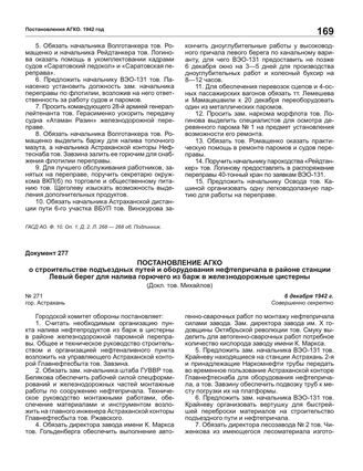 Постановление АГКО № 271 о строительстве подъездных путей и оборудования нефтепричала в районе станции Левый берег для налива горючего с барж в железнодорожные цистерны. 6 декабря 1942 г.
