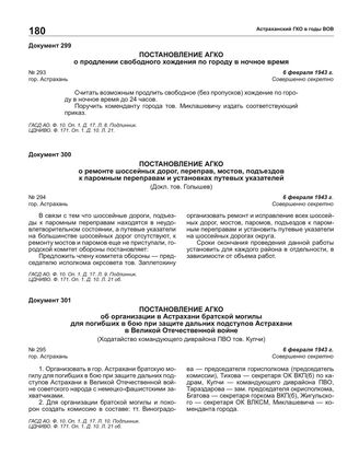 Постановление АГКО № 294 о ремонте шоссейных дорог, переправ, мостов, подъездов к паромным переправам и установках путевых указателей. 6 февраля 1943 г. // ГАСД АО. Ф. 10. Оп. 1. Д. 17. Л. 9. Подлинник. ЦДНИВО. Ф. 171. Оп. 1. Д. 10. Л. 21 об.