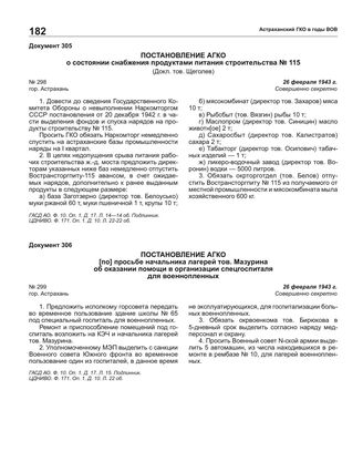 Постановление АГКО № 298 о состоянии снабжения продуктами питания строительства № 115. 26 февраля 1943 г. // ГАСД АО. Ф. 10. Оп. 1. Д. 17. Л. 14-14 об. Подлинник. ЦДНИВО. Ф. 171. Оп. 1. Д. 10. Л. 22-22 об.