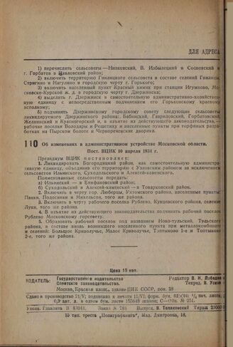 Об изменениях в административном устройстве Московской области. Пост. ВЦИК 10 апреля 1934 г.