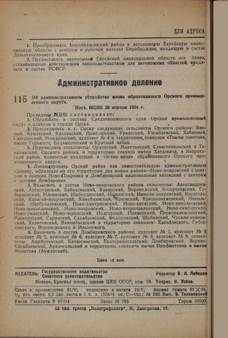 Об административном устройстве вновь образованного Орского промышленного округа. Пост. ВЦИК 20 апреля 1934 г.