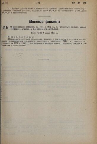 О ликвидации недоимок за 1931 и 1932 гг. по денежным взносам взамен трудового участия в дорожном строительстве. Пост. СНК 7 июня 1934 г.