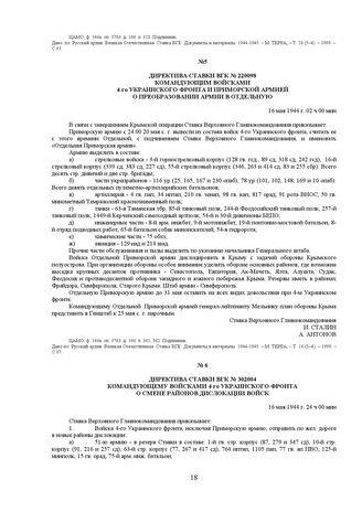 Директива Ставки ВГК № 220098 командующим войсками 4-го Украинского фронта и Приморской армией о преобразовании армии в Отдельную. 16 мая 1944 г. 02 ч. 00 мин.
