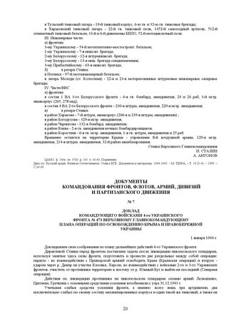 Доклад командующего войсками 4-го Украинского фронта № 473 Верховному главнокомандующему плана операций по освобождению Крыма и Правобережной Украины. 1 января 1944 г. // ЦАМО, ф. 48а, оп. 1795, д. 414, л. 12-23. Русский архив: Великая Отечественная. Ставка ВГК: Документы и материалы. 1944-1945. - М. ТЕРРА, - Т. 16 (5-4). - 1999 - С. 257-260.