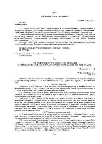 Описание чекистско-войсковой операции по выселению крымских татар по Судакскому району Крымской АССР. [Не ранее 20.05.1944 г.] // РГВА, ф. 38654, оп. 1, д. 23, л. 94об.-95. Подлинник. Сталинские депортации 1928-1953. Сборник документов. Россия XX век. Документы / под ред. А.Н. Яковлева, сост. П.М. Полян и др. - М.: МФД, Материк, 2005. - С.. 503-505.