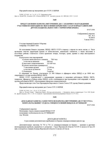 Главная Республики, области и города СССР в годы Великой Отечественной войны Крым, 1944 Докладная записка заместителя наркома внутренних дел УзбССР И.А. Ме...