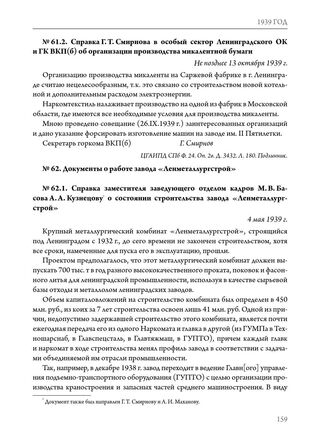 Справка заместителя заведующего отделом кадров М.В. Басова А.А. Кузнецову о состоянии строительства завода «Ленметаллургстрой». 4 мая 1939 г.