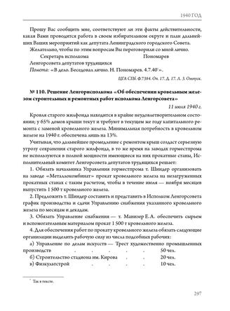Решение Ленгорисполкома «Об обеспечении кровельным железом строительных и ремонтных работ исполкома Ленгорсовета». 11 июля 1940 г. // ЦГА СПб. Ф. 7384. Оп. 18. Д. 1216. Л. 76–76об. Подлинник.