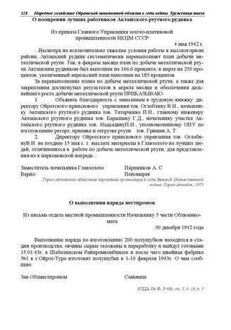 Из приказа Главного Управления золото-платиновой промышленности НКЦМ СССР. О поощрении лучших работников Акташского ртутного рудника. 4 мая 1942 г.