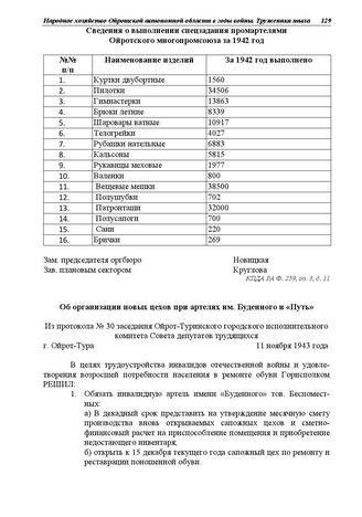 Сведения о выполнении спецзадания промартелями Ойротского многопромсоюза за 1942 год