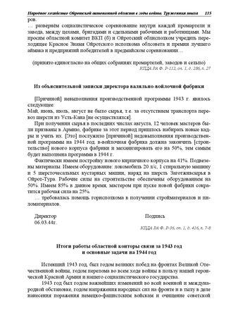 Итоги работы областной конторы связи за 1943 год и основные задачи на 1944 год // КПДА РА. Ф. Р-337, оп. 1, д. 25, лл. 40, 41, 43, 45, 47, 49, 50.