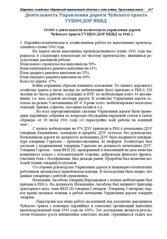 Отчет о деятельности политотдела управления дороги Чуйского тракта ГУШОСДОР НКВД за 1941 г. // КПДА РА. Ф. 46, оп. 1, д. 75, лл. 13-19.