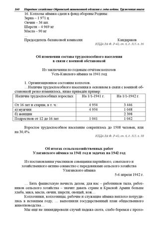 Из заключения по годовым отчетам колхозов Усть-Канского аймака за 1941 год. Об изменении состава трудоспособного населения в связи с военной обстановкой // КПДА РА. Ф. P-42, оп. 6, д. 315. л. 38.
