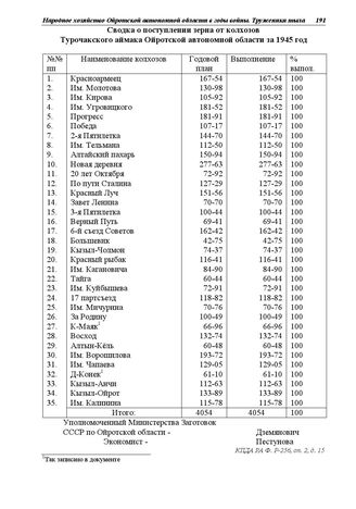 Сводка о поступлении зерна от колхозов Турочакского аймака Ойротской автономной области за 1945 год // КПДА РА. Ф. Р-256, оп. 2, д. 15.