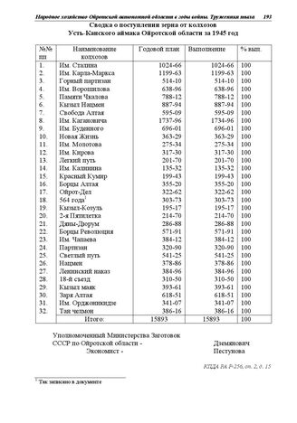 Сводка о поступлении зерна от колхозов Усть-Канского аймака Ойротской области за 1945 год // КПДА РА. Ф. Р-256, оп. 2, д. 15.