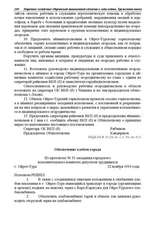 Из протокола № 31 заседания городского исполнительного комитета депутатов трудящихся. Обеспечение хлебом города. г. Ойрот-Тура. 22 ноября 1943 г. // КПДА РА. Ф. Р-36, оп. 1, д. 398, л. 9.