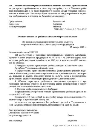 Из протокола заседания исполнительного комитета Ойротского областного Совета депутатов трудящихся. О плане заготовки рыбы по аймакам Ойротской области. 12 января 1942 г. // КПДА РА. Ф. Р-33, оп. 6, д. 72, лл. 212-213.