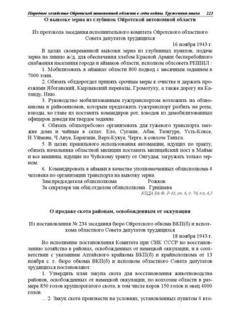 Из протокола заседания исполнительного комитета Ойротского областного Совета депутатов трудящихся. О вывозке зерна из глубинок Ойротской автономной области. 16 ноября 1943 г. // КПДА РА. Ф. Р-33, оп. 6, д. 78, лл. 4, 5.