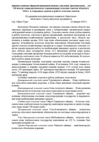Из решения исполнительного комитета Ойротского областного Совета депутатов трудящихся. Об итогах социалистического соревнования сельских советов области в 1944 г. и очередных задачах в работе сельских советов. г. Ойрот-Тура. 22 января 1945 г.