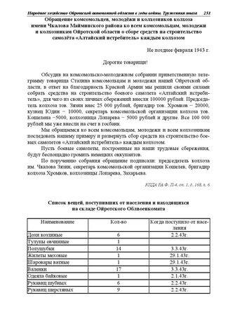 Обращение комсомольцев, молодежи и колхозников колхоза имени Чкалова Майминского района ко всем комсомольцам, молодежи и колхозникам Ойротской области о сборе средств на строительство самолета «Алтайский истребитель» каждым колхозом. Не позднее февраля 1943 г. // КПДА РА. Ф. П-4, оп. 1, д. 168, л. 6.