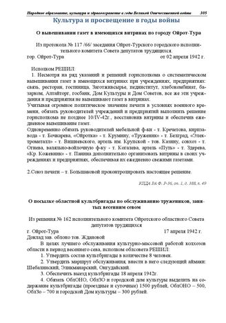 Из протокола № 117/66/ заседания Ойрот-Турского городского исполнительного комитета Совета депутатов трудящихся. О вывешивании газет в имеющихся витринах по городу Ойрот-Тура. 2 апреля 1942 г. // КПДА РА. Ф. Р-36, оп. 1, д. 388, л. 49.