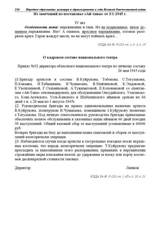 Приказ № 52 директора областного национального театра по личному составу. О кадровом составе национального театра. 26 мая 1945 г. // КПДА РА. Ф. Р-223, оп. 1 «Л», д. 20, л. 21.