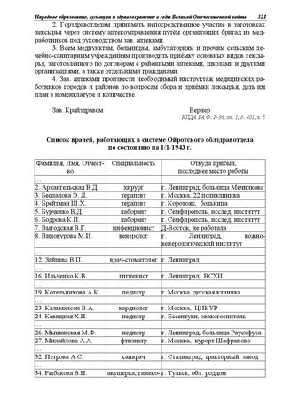 Список врачей, работающих в системе Ойротского облздравотдела по состоянию на 1/1-1943 г. // КПДА РА. Ф. Р-44, оп. 11, д. 5, лл. 25-26.