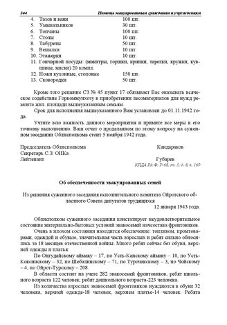 Из решения суженного заседания исполнительного комитета Ойротского областного Совета депутатов трудящихся. Об обеспеченности эвакуированных семей. 12 января 1943 г. // КПДА РА. Ф. Р-68с, оп. 5, д. 11, л. 10.