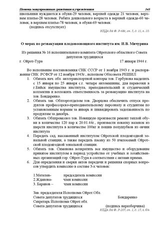 Из решения № 16 исполнительного комитета Ойротского областного Совета депутатов трудящихся. О мерах по реэвакуации плодовоовощного института им. И.В. Мичурина. 17 января 1944 г.
