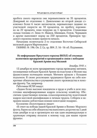 Из информации Иркутского горкома ВКП(б) об откликах колективов предприятий и организаций в связи с победами Красной Армии под Москвой. Декабрь 1941 г. // ГАНИИО. Ф. 159. Оп. 7 а. Ед. хр. 11. Л. 190-191.