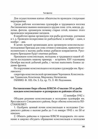Постановление бюро обкома ВЛКСМ «О вылове 50 кг рыбы каждым комсомольцем» и разнарядка по районам области. 12 октября 1942 г. // ГАНИИО. Ф. 185. Оп. 1. Ед. хр. 276 а. Л. 77-78.