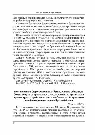 Постановление бюро обкома ВКП(б) и исполкома областного Совета депутатов трудящихся о мероприятиях по организации приема, трудоустройства и культурно-бытового обслуживания демобилизованных воинов Красной Армии. 17 июля 1945 г.
