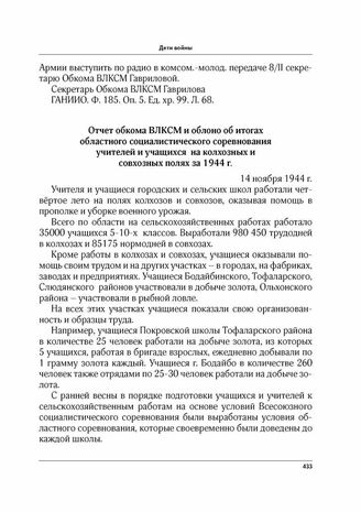Отчет обкома ВЛКСМ и облоно об итогах областного социалистического соревнования учителей и учащихся на колхозных и совхозных полях за 1944 г. 14 ноября 1944 г. // ГАНИИО. Ф. 185. Оп. 5. Ед. хр. 99. Л. 162-163. Подлинник.