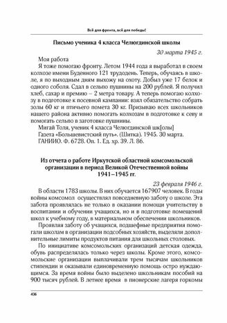 Из отчета о работе Иркутской областной комсомольской организации в период Великой Отечественной войны 1941-1945 гг. 23 февраля 1946 г. // ГАНИИО. Ф. 185. Оп. 1. Ед. хр. 369. Л. 43-47.