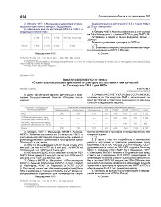 Постановление ГКО № 1696сс «О капитальном ремонте арттягачей и тракторов и о поставке к ним запчастей во 2-м квартале 1942 года для НКО». 4 мая 1942 г.