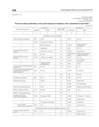 Приложение № 9 к постановлению ГКО № 1707сс от 06.05.1942 г. «План поставки штамповки и литья для корпусов снарядов, мин и авиабомб на май 1942 г.» // РГАСПИ. Ф. 644. Оп. 1. Д. 33. Л. 179-181. Зав. копия.