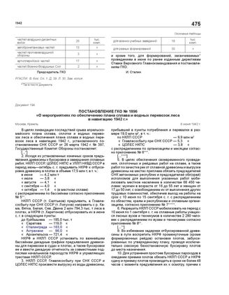 Постановление ГКО № 1896 «О мероприятиях по обеспечению плана сплава и водных перевозок леса в навигацию 1942 г.». 8 июня 1942 г.