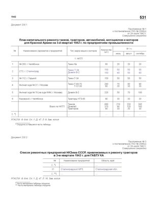 Приложение № 3 к постановлению ГКО № 2086сс от 24.07.1942 г. «Список ремонтных предприятий НКЗема СССР, привлекаемых к ремонту тракторов в 3-м квартале 1942 г. для ГАБТУ КА»