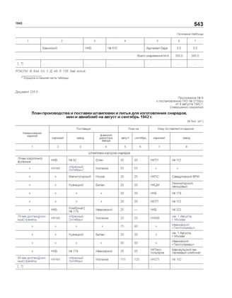 Приложение № 9 к постановлению ГКО № 2138сс от 04.08.1942 г. «План производства и поставки штамповки и литья для изготовления снарядов, мин и авиабомб на август и сентябрь 1942 г.»